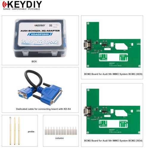 1pc x KEYDIY BCM2 Board for Audi 5th IMMO System BCM2 (3634) 1pc x KEYDIY BCM2 Board for Audi 5th IMMO System BCM2 (3635) 1pc x Dedicated cable for connecting board with KD-X4