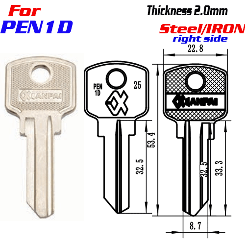 / F-308 Steel Thickness 2.0mm pen-1d door key blanks RIGHT side
